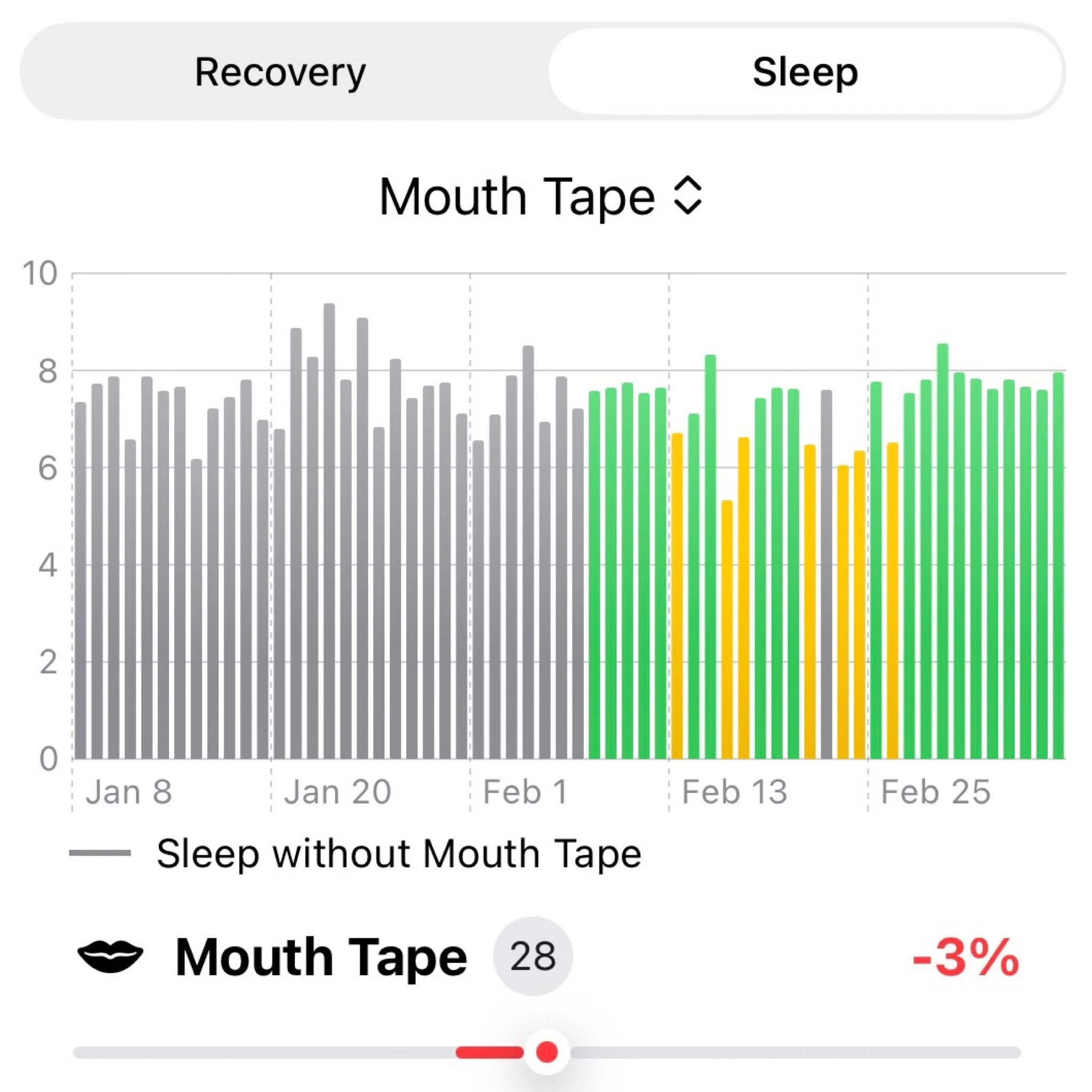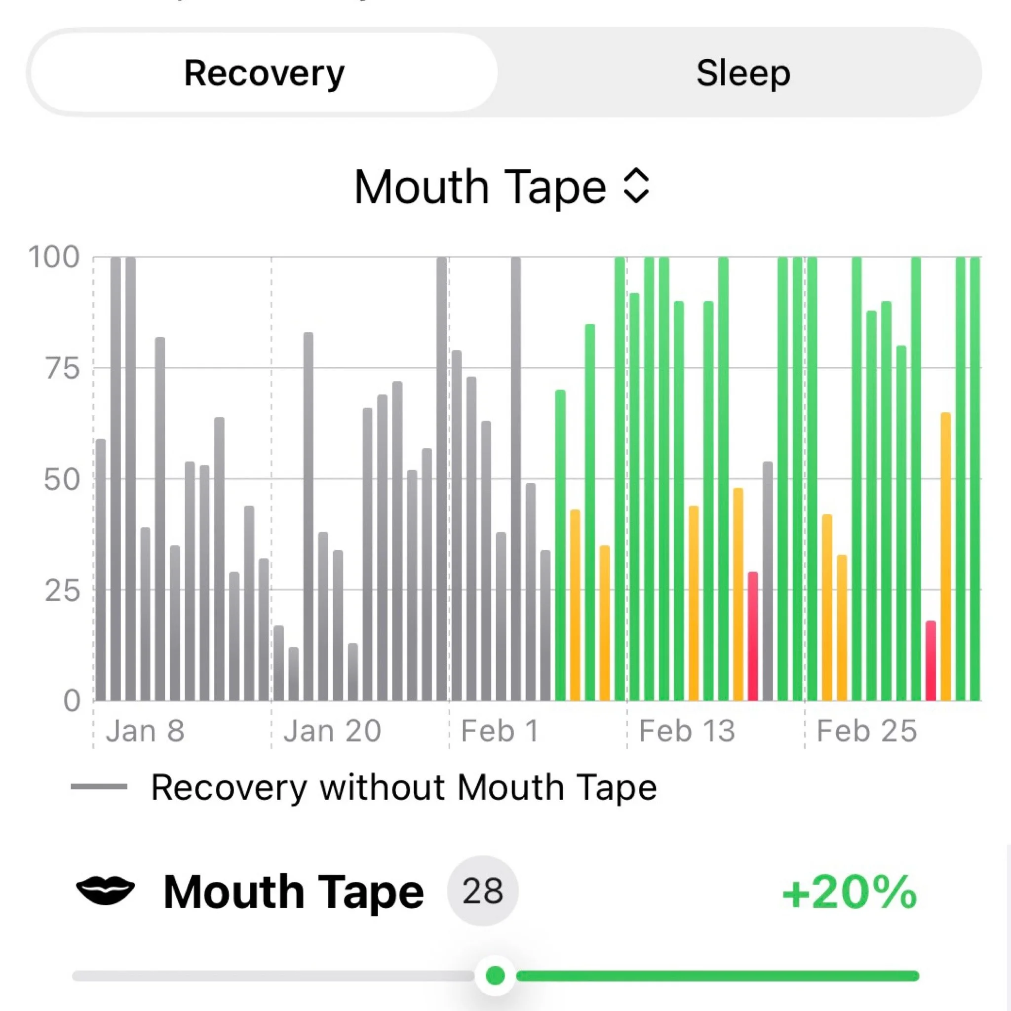 Compared to my normal baseline range, my recovery score increased by about 20% during the period where I used mouth tape.